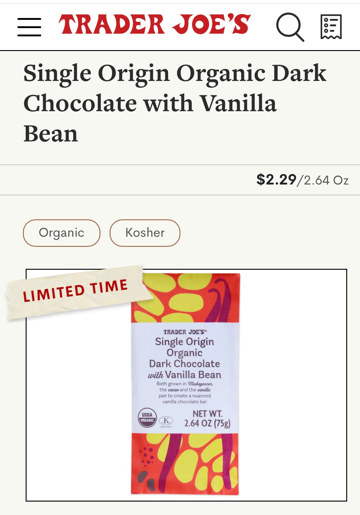I also did not set out, yesterday when I stopped at our local Trader Joe’s and spied the Single Origin Organic Dark Chocolate with Vanilla Bean bar, made with, as the label states front and center,