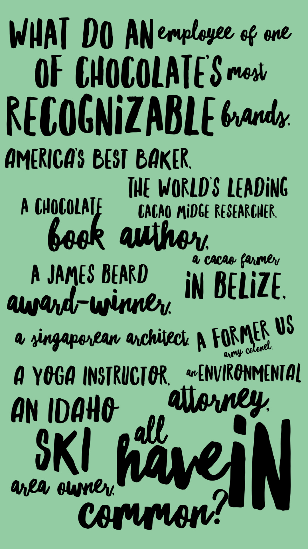 I never, in fact, set out to teach chocolate. It was a natural flow of how my brain thinks, which seems to want to turn over every rock (detail) in its path and get a closer look. But that’s not enough for me: I like to point out the beautiful bits hidden just off the well-trod path, also the scarier things it’s easy to trip over no matter how many times before we’ve been at that exact spot.