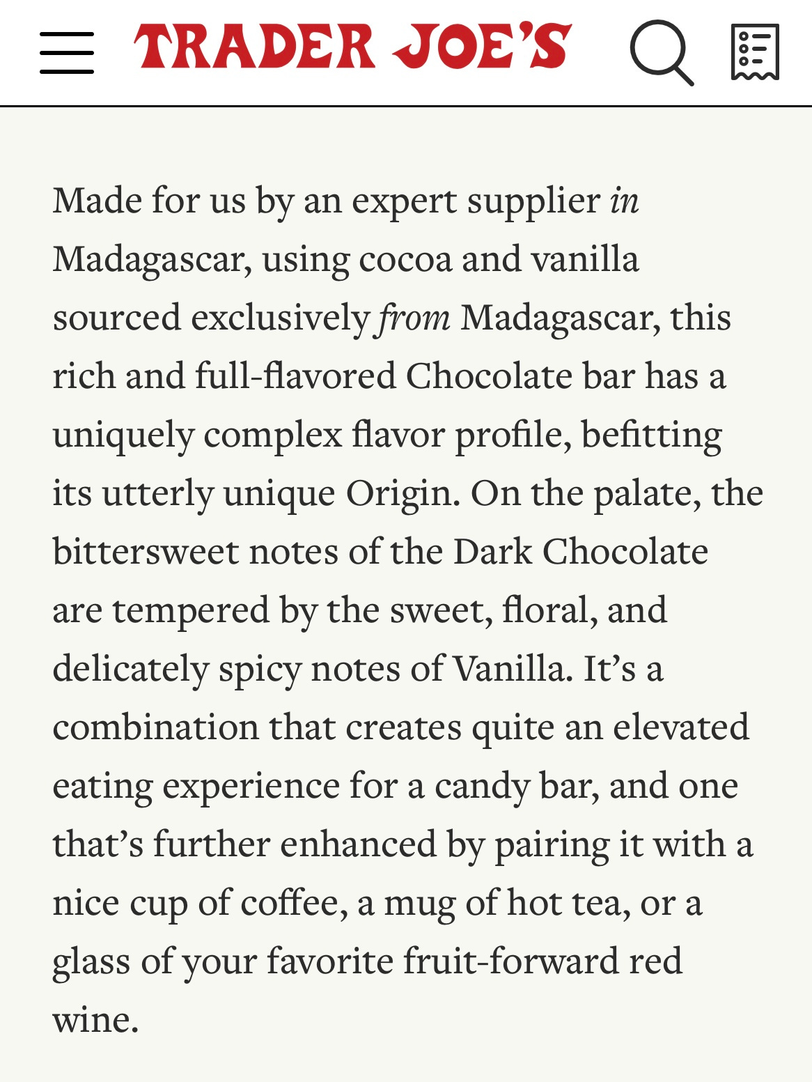 This TJ’s bar might remind them of Tony’s, namely, that a different, purposeful, approach to chocolate is a thing.